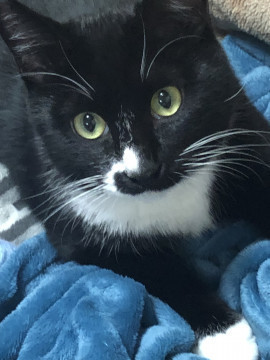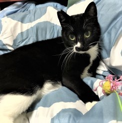 | 特徴(性格など) | 仮名:レオくん(オス) 毛色:黒白、尻尾長い、ひげが長く、瞳がグリーンです。 性格:お家ではスリゴロで、威嚇なく抱っこ出来ますが、長い時間の抱っこは好きではなく、特に男の人の抱っこは慣れていません。撫でられるのは大好きです。 一人でベッドの下を走ったり、人の前でわざと物をおとして気を引いたりします。 猫じゃらしで遊ぶのも大好きです。人は好きですが、大勢の人を見る機会がないので、譲渡会が苦手です。 緊張して怖くなってしまいます。 |