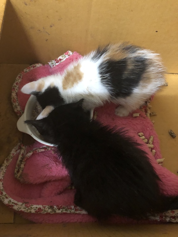 | 特徴(性格など) | 黒色のトラ柄の子、男の子です! 三毛の子女の子です! 二匹仲良しなので二匹一緒に引き取ってくれる方! 今は缶詰を食べてます! |