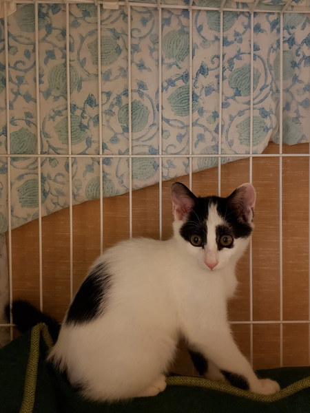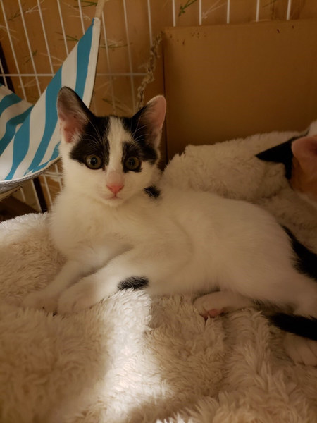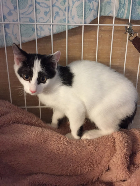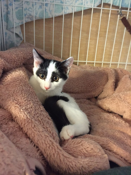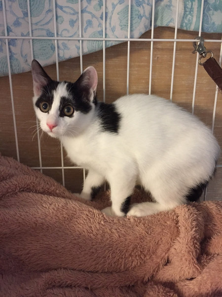 | 特徴(性格など) | ボクは、テンくんでしゅ ボクのお顔って、しょんなに個性的にゃのかにゃ? でも、ボクちんかわいいでちょ!? あにょね、ボクね、ヘタレにゃんだ だからいつも同じキョウダイのラムちゃんとくっついているんだよ。 弱虫のボクだけど、おもちゃで遊ぶのは大好きにゃんだー ラムちゃんと一緒に新しい家族の所に行けたら、ボク達すごく幸せだにゃ♡ よろちくおねがいしますにゃ ―――――――――――――――――――――――――――――― アートスティックな個性的な柄が特徴のかわいい白黒子猫ちゃんのご紹介です。 生後4ヶ月です。 まるで歌舞伎役者のようなメイク柄に、まん丸のクリクリのお目めが特徴的です。 性格は、ヘタレでびびりです。 ムギュッと抱いてしまえば、固まってしまいます。 まだ少しビクビクしているので、あと一歩踏み出せば、スリゴロさんになると思います。 まだまだのびしろがある子です。 同じく一緒に譲渡会に出場する三毛猫のラムちゃんとキョウダイです。 二匹ともとても仲良しなので、もし可能でしたら二匹一緒に迎えてくださるとありがたいです。 ちょうど生後4ヶ月ぐらいになりますので、去勢手術をしてからのお届けとなります。 ケージ生活に慣らしてあるので、迎えてくださる方は、ケージのご用意をお願いします。 先日の大型台風の経験から、何かあった時などを考慮し、ケージのご用意をオススメしております。 お留守番も出来ますので、お仕事をお持ちのご家庭でもOKです。 びびりちゃんなので、小さなお子さんがいるご家庭向きではありません。 テンくん。まだまだ不器用な所もありますが、とてもかわいい子なので、ぜひとも、よろしくお願いします。 同じくキョウダイのラムちゃんもよろしくお願いします。 |