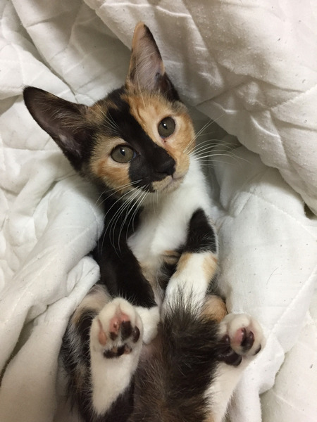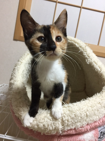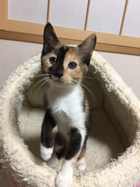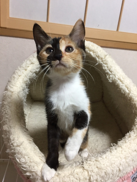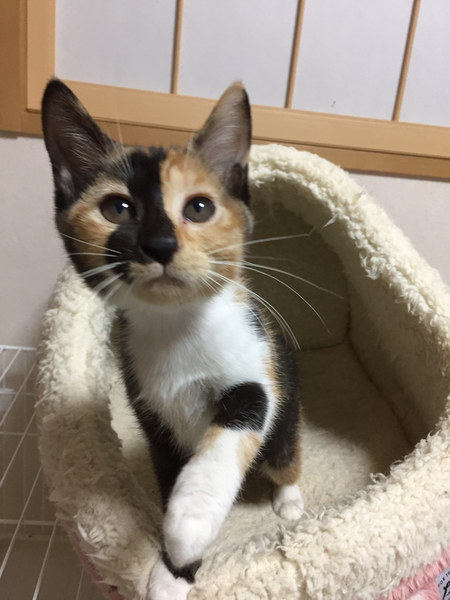| 特徴(性格など) | あたちは、りえちゃんでしゅ 人も猫もだいしゅきだよ。 特に遊ぶことがだいしゅき♡ 毎日、よく食べて、よく遊んで、いっばいお昼寝して、またあそぶ。 毎日、毎日、楽しいにゃ〜 ジョートカイ?にゃにそれ?おいしいのかにゃ? まー、いいや。 にゃんだか知らにゃいけど、幸せになるために出るんだってー。 楽しみだにゃ〜♡ ―――――――――――――――――――――――――――――― 人懐っこくて、スリスリゴロゴロのあまあまの三毛猫の子猫ちゃんのご紹介です。 離乳間もない頃に保護したので、人に対する警戒心がありません。 人も猫も大好きなので、とても飼いやすい子だと思います。 まだまだ遊びたい盛りなので、おもちゃなどで遊んであげてください。 猫飼い初心者OK。 先住猫飼いOK。 お子さんOK(アレルギー検査をパスしているご家庭) お留守番は、パートタイムぐらいの半日のお留守番ぐらいならば可能です。スタッフまでご相談ください。 りえちゃんを迎えてくださる飼い主さんは、堪らなくかわいいと思います。 文句なしのかわいこちゃんですので、ぜひ、よろしくお願いします。 |