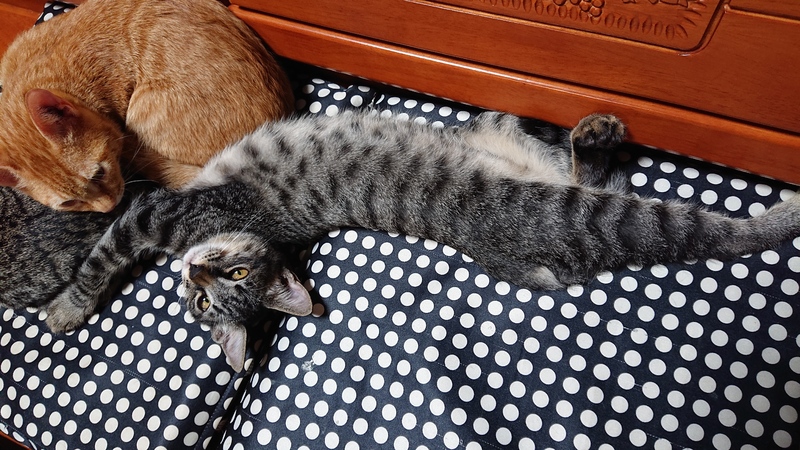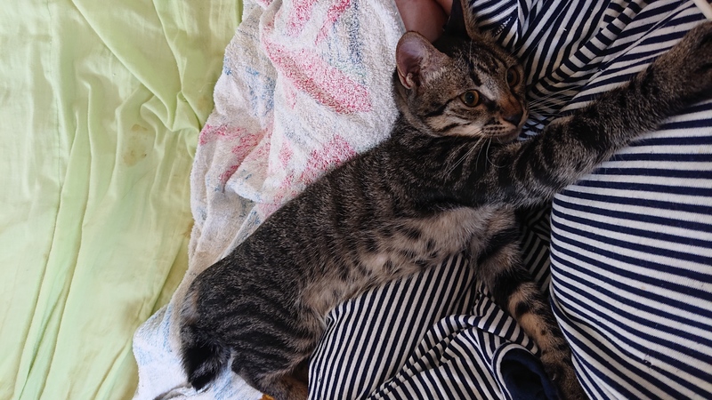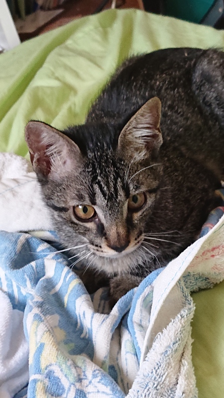 | 特徴(性格など) | 【色柄】キジトラ 【血液検査】猫エイズ陰性、猫白血病陰性 ※レボリューション済 生まれて2日目から人が育てているので、人の傍が安心できるようです。 人の気配がすると自分からよってきて、隣で眠ったり遊んだりします。 ひざの上と抱っこが大好きです。 幸せを引っかけるというカギ尻尾。 兄弟姉妹みんなと仲良しで元気いっぱいです。 |