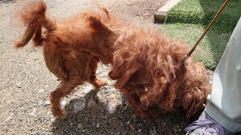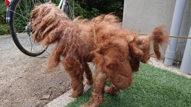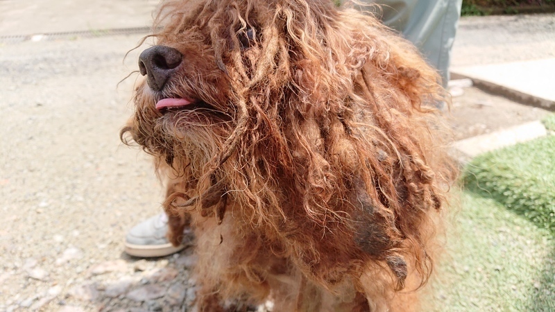 | 里親募集する理由 | 行政機関で保護されました。 首に電気の走る首輪がきつく巻き付けられていました。 何年もカットされていない状態で、うんちまみれに、なっていました。 おちんちんも、切られていて、手術を受けました。 今は、おしっこが、きちんと出ます。 |