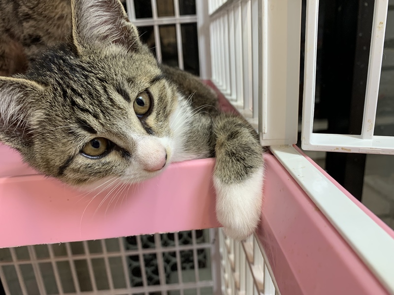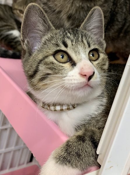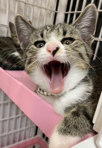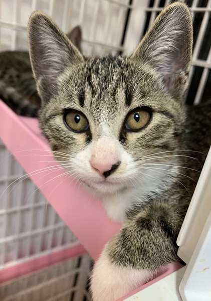 | 特徴(性格など) | 「カンロ」という名前の雑種(キジ白)の男の子です。 元気に兄妹で遊んでいます。 自分から「遊んで〜!」と寄ってきます。 手袋をしたような可愛い手がチャームポイント。 ニッキ母さんの子供です。 FIV・FeLV ともに陰性 |