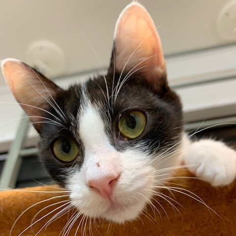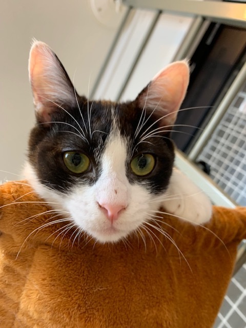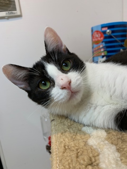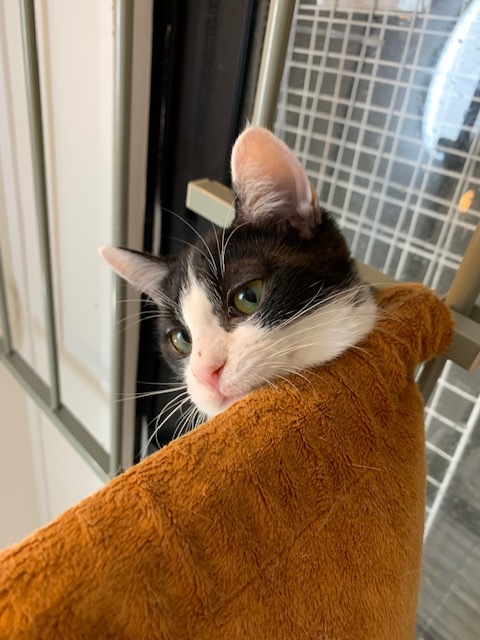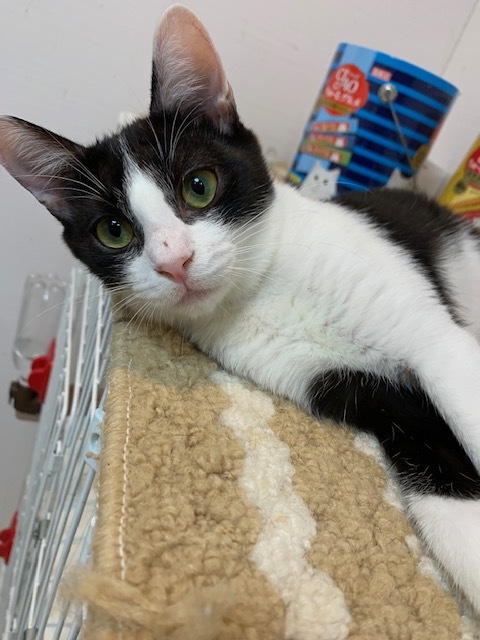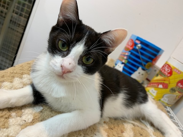 | 特徴(性格など) | 「プンプン」という名前の雑種(ハチワレ)の女の子です。 綺麗な美人さんです。 控えめな甘えん坊でオヤツを見せると走ってきます。よく食べて元気に遊んでます。 生後1ヶ月でレスキューした時はシャーシャー怒ってたので名前はプンプンになりました。 今はその面影もなく穏やかな良い子です。 FIV・FeLV ともに陰性 |