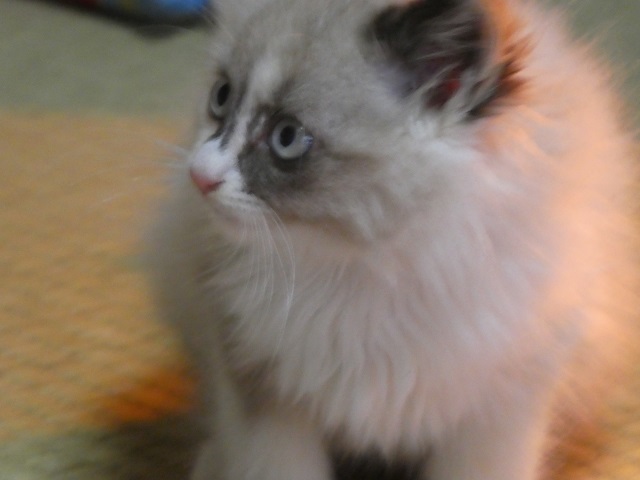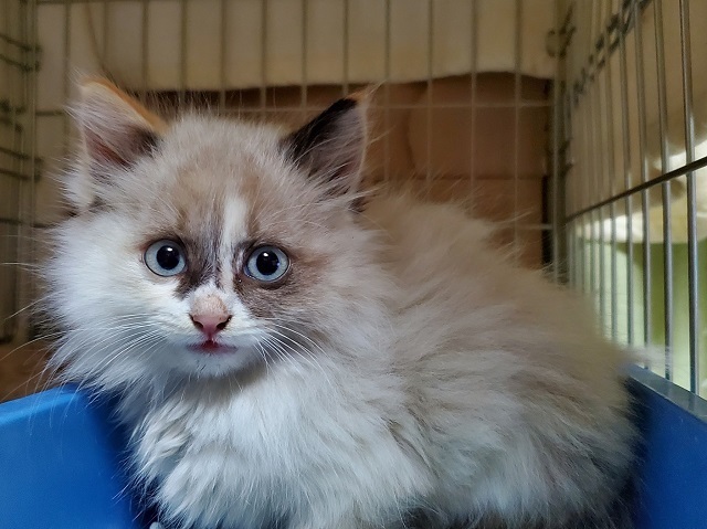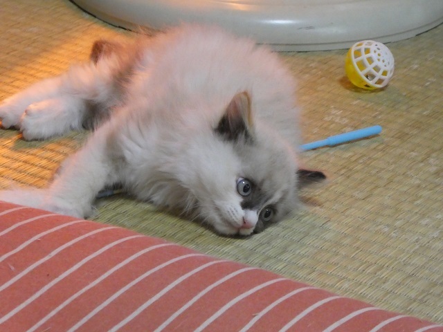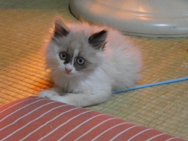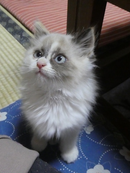 | 特徴(性格など) | ふわふわモコモコの柔らかい毛をしています。 良く食べて元気。ネコじゃらしや丸い玉を追いかけて遊んでいます。 お腹が空いたときにケージの中で鳴くだけで、それ以外は鳴かずにただチョロチョロしてるだけ(笑) ちょっと目を離すと何処へ行ったのかわからなくなってしまいます。大人の猫たちにも物おじすることなく近寄って行き、シャーとかされますが全然平気。とにかく見ていてあきません^^ 寂しがりの甘えん坊なので先住猫がいてもOKです。 |