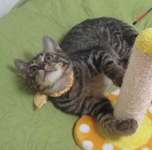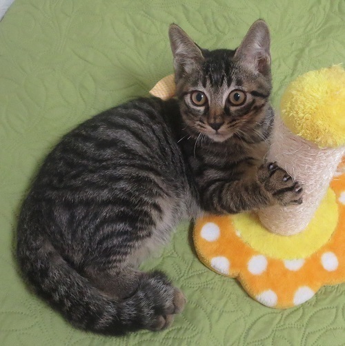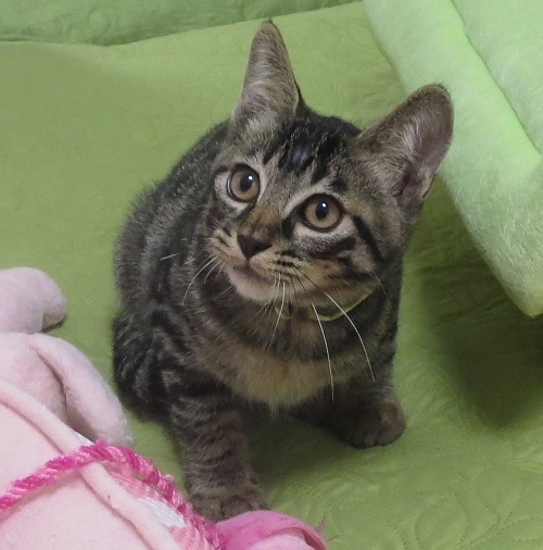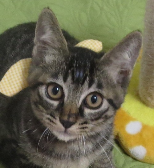 | 特徴(性格など) | 目の大きいハンサムなキジトラくんです。そっくりのグラと兄弟です。保護した当時はかなりビビって固まっていましたが、大人しい性格で、撫でてるとすぐにゴロゴロ言うようになりました。ビビリな子ですが、可愛がればどんどん甘えん坊になっていく子です。 | ||