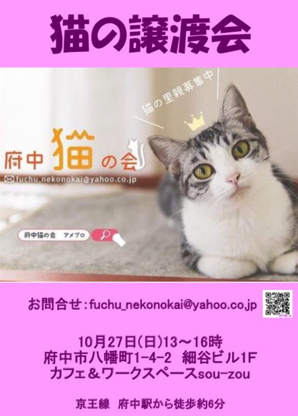 | その他(譲渡条件など) | ◆譲渡会案内◆ ♠︎10月27日(日) ♠︎13時〜16時(15時30分まで受付) ♠︎会場は【カフェ&ワークスペース sou-zou】 (譲渡会場が今までと違う会場に変更します。必ずご確認ください) ・京王線【府中駅】から徒歩6分 ・駐車場はございません。 ・お車でお越しの方は最寄りのパーキングにお願いします。 ・自転車を止めるスペースがないので、お近くの府中駅東自転車駐輪場をご利用ください。日曜日、祝日は、無料です。 ※会場へ直接のお問い合わせは、ご遠慮ください。 fuchu_nekonokai@yahoo.co.jpまで。 【カフェ&ワークスペース sou-zou】 http://sou-zou.jp/ ―――――――――――――――――――――――――――――― ※譲渡会にお越し頂いた方を優先に譲渡したいと考えております ※譲渡会は予約制ではございません。また、先着順ではなく、希望者様の中から選考とさせて頂いております 【お願い】会場への直接の問合せはお控え下さい。必要な場合は、府中猫の会へ原則mailでお願い致します。 ※猫ちゃんの体調等、最新情報はblogに掲載しますので、適宜checkをお願いします! http://ameblo.jp/team-rose-cats/ ▲応募条件 ・ペット可の住宅。 ・完全室内飼い(脱走防止に配慮いただける方) ・定期的な健康check(必要な医療処置を含む) ・終生飼育(ご高齢または単身の方は、後見人相当の方のご同意をお願いします) ・ワクチン、去勢避妊の医療費(証明書類を提示またはお渡しします)を負担いただける方 ※リクエストに応じ環境に慣れるまでの間、ケージを無償レンタルすることも可能です(数に限りがあるので、その点ご承知ください) ▲応募可能地域 埼玉県南東部、東京都、神奈川県北東部. 移動による猫の負担を考慮し、調布飛行場から40km圏内にお住まいの方 詳しくは譲渡会場にてお尋ね下さい。 ※対応をスムーズに行うため、飼育経験,ご家族構成,応募の動機など、簡単なアンケート(当日配布)にご協力ください ※当日の引渡しではなく、後日ご自宅へお届けとなります ※当日ご来場不可の方は、開催日以降にmessage機能または、mailでお問合せ下さい。 |
