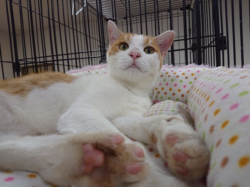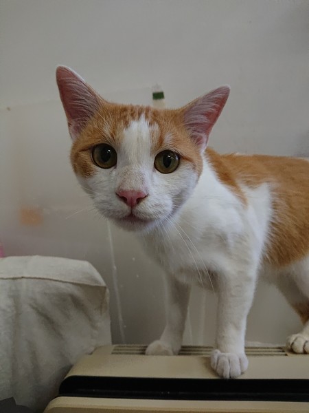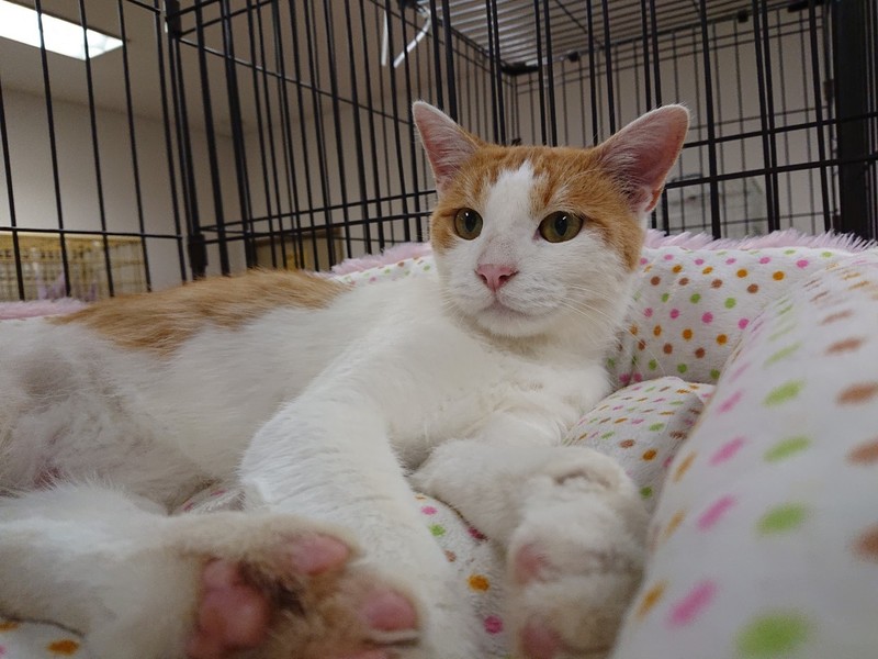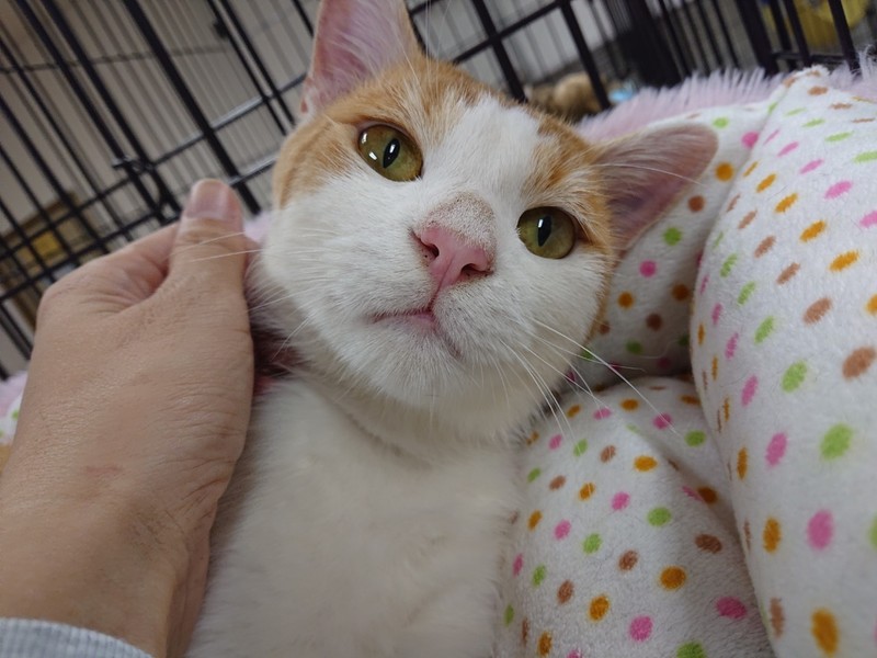 | 特徴(性格など) | 2017.1.1生まれ(推定) 毛色:茶白 元は飼い猫だった為、とっても人懐こい男の子です。 抱っこされると、くた~っと身を任せてくるので、モチモチとろとろに溶けてしまうのではないかという抱き心地です。 しっぽの先は幸運の鍵しっぽ。 座った時、角度によって大きなハートが現れます。 |