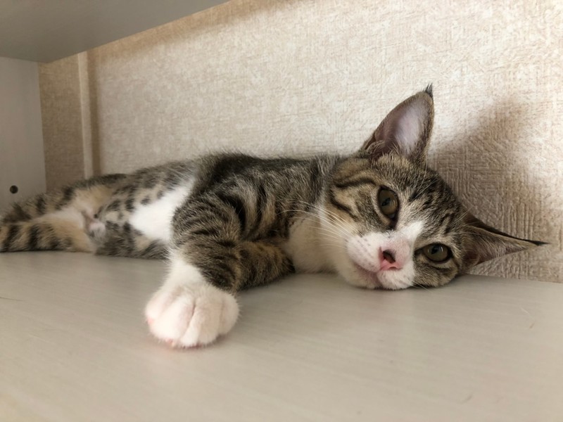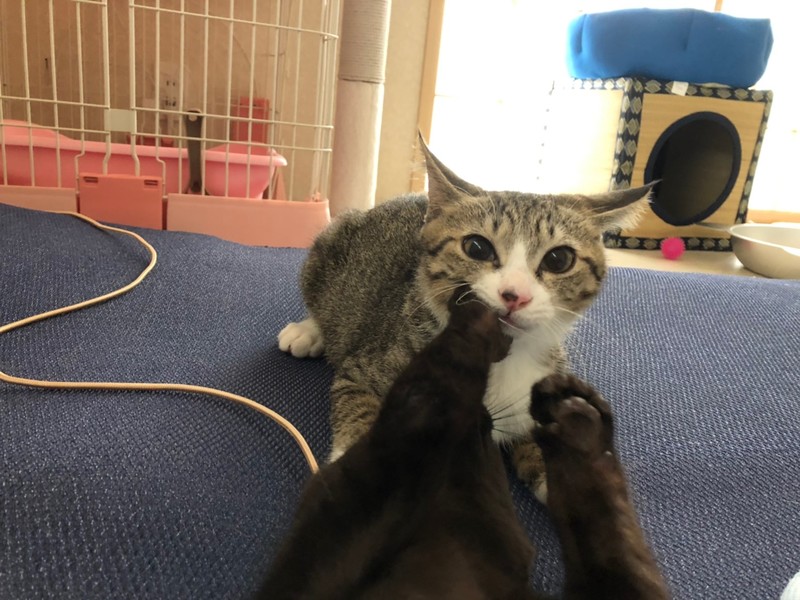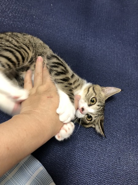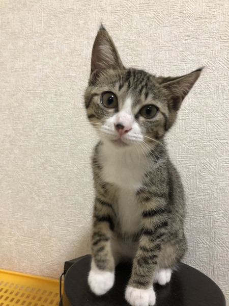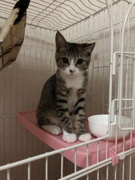 | 里親募集する理由 | 譲渡会帰りにガソリンスタンドに寄った際、偶然ピョコピョコ歩いていた子猫に遭遇。 交通量の激しい幹線道路脇のスタンドだった為、緊急保護しました。 現在預かりボランティアのお家で沢山の子猫と一緒に元気に成長中です。 |