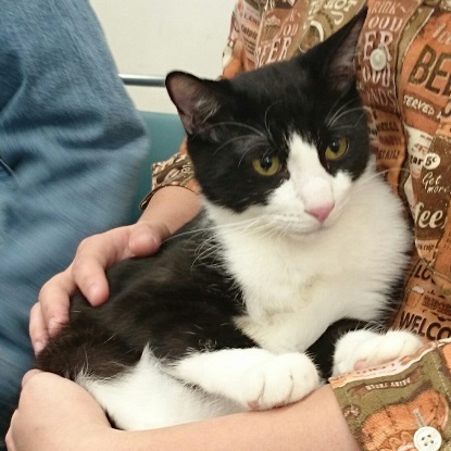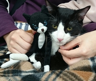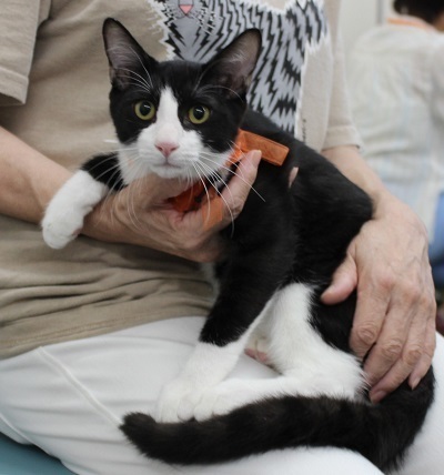 | 特徴(性格など) | 白黒の八割れ猫です。愛くるしい性格の子猫。 元気いっぱいです。白いソックスを履いています。 おもちゃを投げると、足元へ持ってきて遊んでと誘います。 |