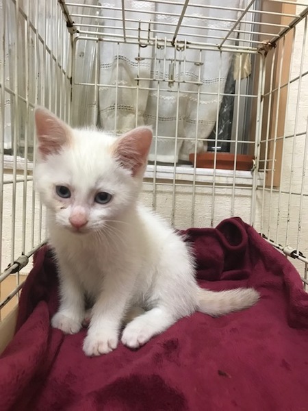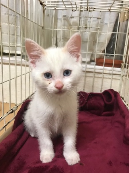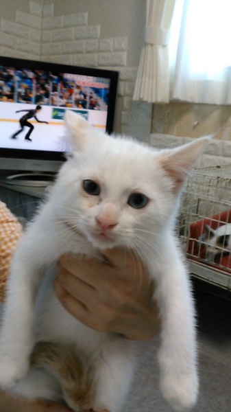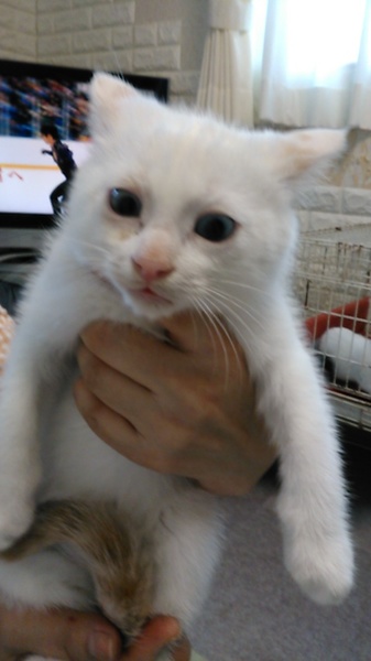 | 特徴(性格など) | 目が青くてきれいな子です。白に薄いクリーム色の模様があり、しっぽは長いです。 人懐こい性格ですが、少し臆病なところもあります。 |