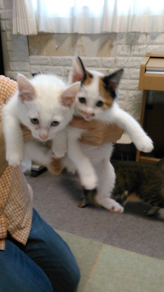 | その他(譲渡条件など) | ペット可住宅にお住まいの既婚者の方にお願いします。完全室内飼いのため、脱走防止に十分気を付けて頂けるようお願いします。ワクチン、去勢手術を確実にお願い致します。兄妹二匹でもらって頂けたらと思いますが、先住猫さんがいらっしゃる場合は白茶くん一匹だけでも構いません。 お見合い、一週間位のお試し飼いは可能です。 |