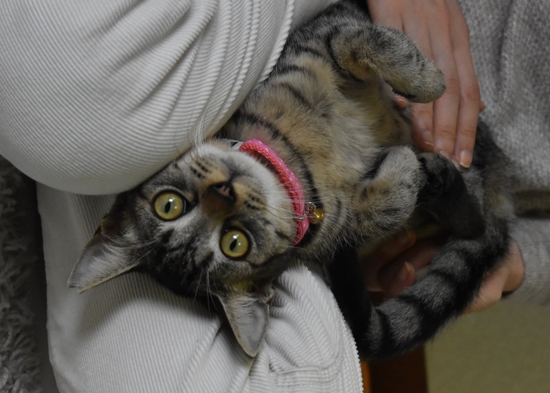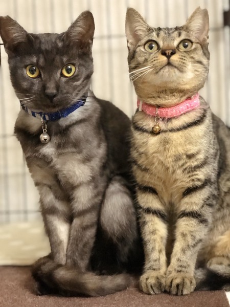 | 特徴(性格など) | きれいなキジトラでしっぽは長くてまっすぐです。まん丸のお目目がチャームポイントです。 だっこも大好すきな穏やかな甘えん坊で、人も猫も大好な性格花丸な女の子です。 保護した4匹の猫たち(銀、りん、すず)ととっても仲良しですので、2頭一緒か先住猫さんのいるお家を希望しています。 |