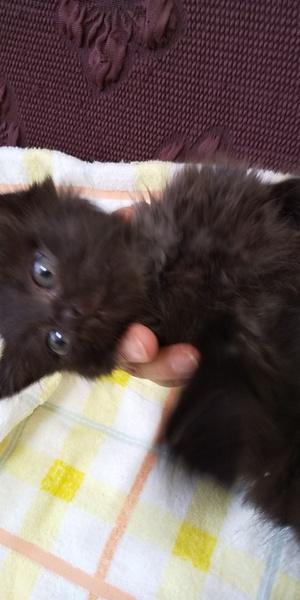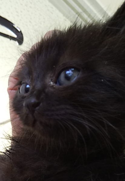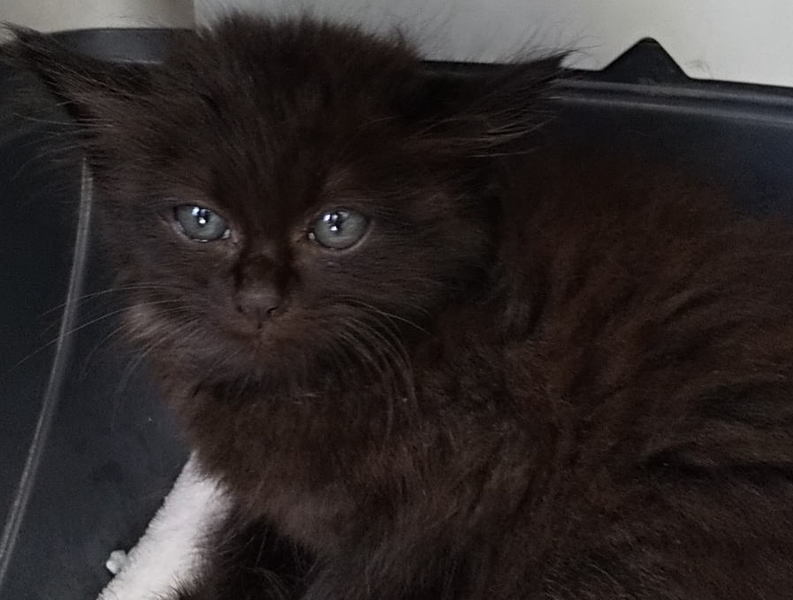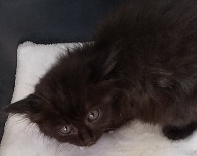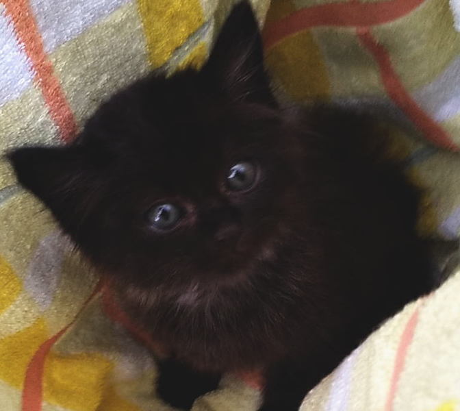 | 特徴(性格など) | 黒色にグレーのポイント(あごの下から胸にかけて)があります。この大きさで毛が長いので大きくなるとゴージャスになりそうです。目の色はまだ小さいのでわかりにくいのですが、黄色系だと思います。 しばらく放浪していたようでガリガリ(毛で分かりにくいですが)ですが、アウアウ言いながらご飯をたくさん食べているのですぐにコロコロになりそうです。 獣医さんで拾った日に簡単な健康診断とアドボケート(ノミダニ駆除フィラリア予防)をしています。 シャーシャー言っているのですが、抱っこすると顔を寄せてきてゴロゴロと甘えます。 写真写りがめちゃくちゃ残念なのですが、本当は可愛らしいです。 |