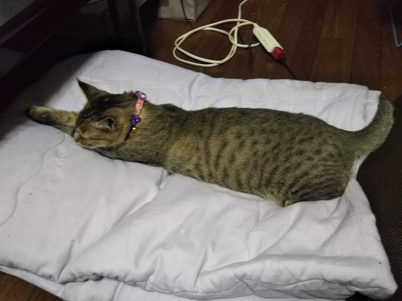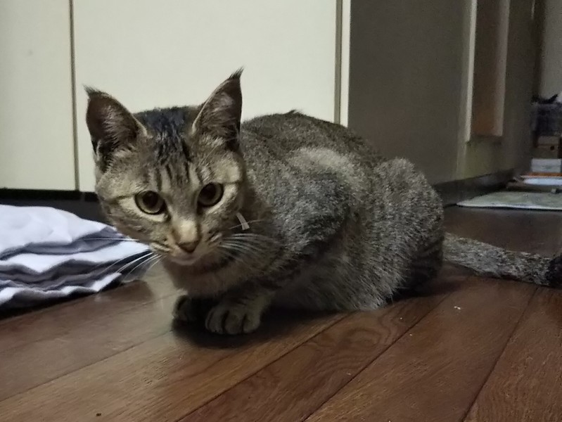 | 特徴(性格など) | 茶色、薄目のキジトラ。 甘えん坊で触られる(撫でられる)のは大好きなようです。部屋に勝手に入って来ただけでも図々しいのに、布団だけ与えて放置してたら、初日から膝に乗ってきてそのままスヤスヤと寝てしまいました。 |