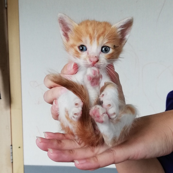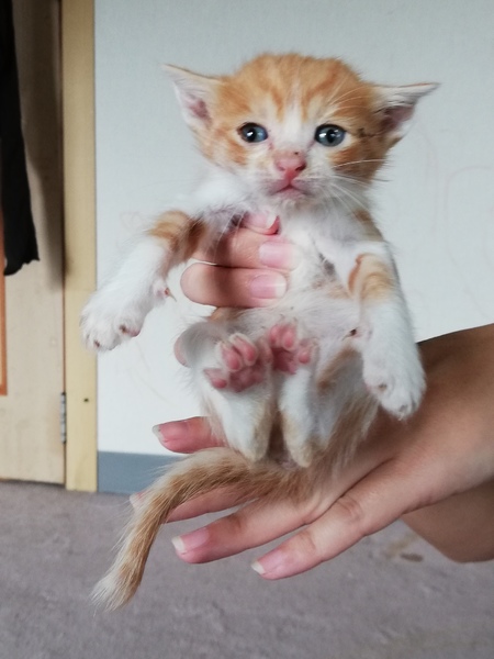 | 特徴(性格など) | 茶トラのチャオ、甘えん坊の男の子。トイレもバッチリおぼえました! しっぽは長いです。 健康状態 毎日元気に飛び回っています。離乳食も良く食べ、健康的です。 行った医療処置 ・動物病院での体調チェック ・ノミダニ駆除 ※血液検査はしておりません。 |
