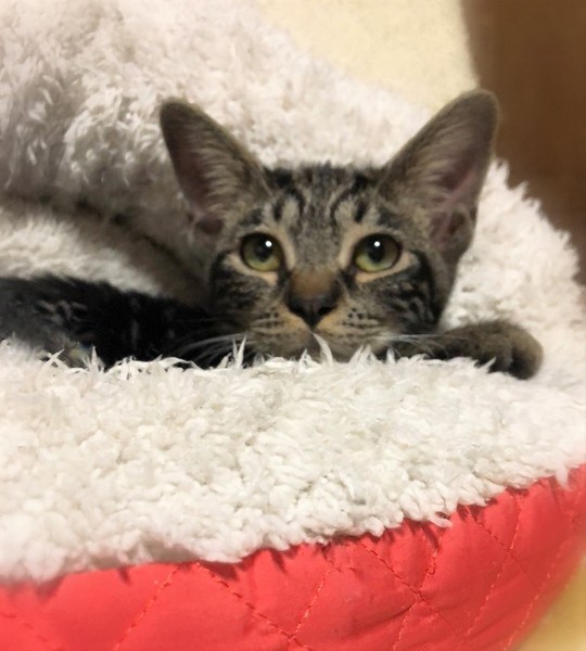 | 特徴(性格など) | 仮名、ぎずも 顔はキジトラ・体はアメショ風のしましま柄の女の子 膝が大好き過ぎて初対面でも抱っこされると、くつろぎそのまま眠ってしまう大らかさん。 甘えたくなると、じぃーっとこちらを見つめつつ膝に手を伸ばして来ます。 しょぼぼ顔が可愛い甘えん坊です。 |