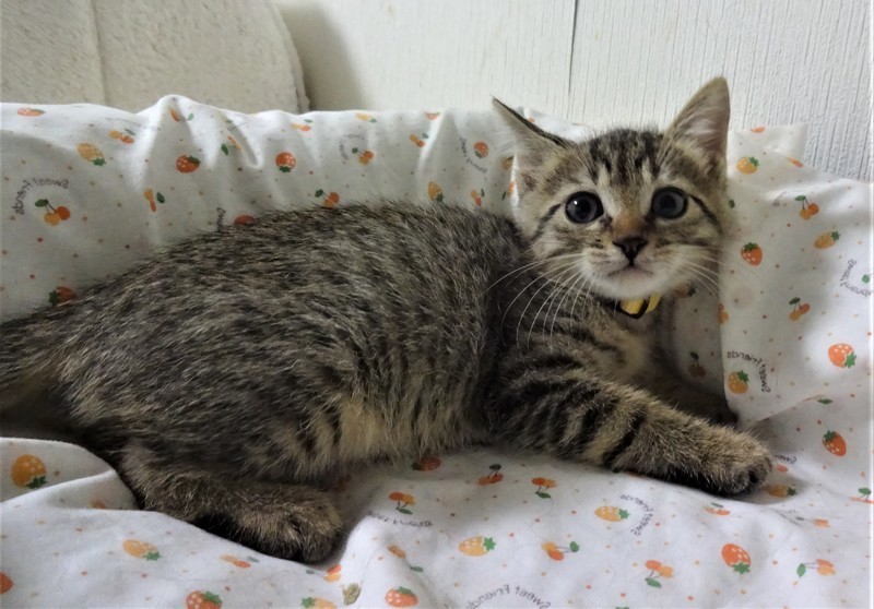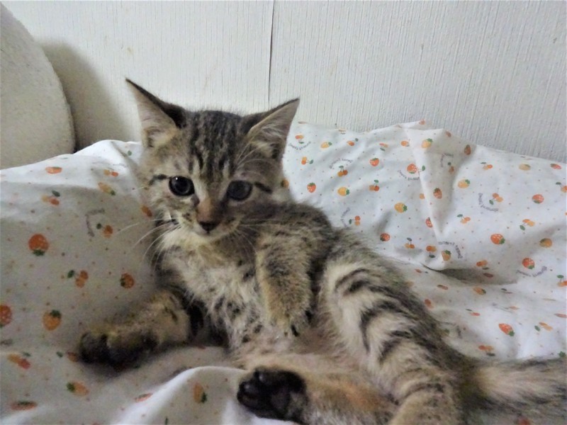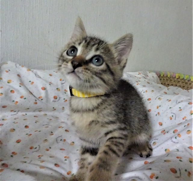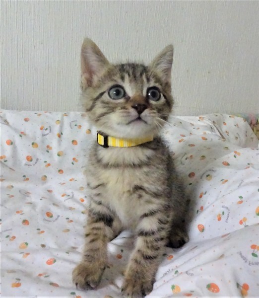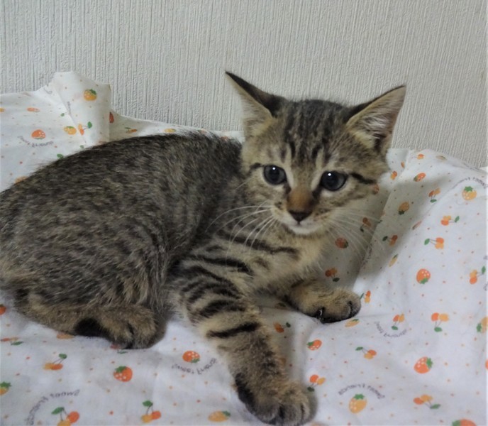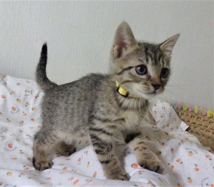 | 特徴(性格など) | 仮名: まさるくん(オス) 毛色; キジトラ(明るめ) 性格: 怖がりの面がありますが、おっとりしています。 ですから、おもちゃなどは兄弟に取られてしまいます。 いつも兄妹に毛繕いしてやる優しい子ですが、プロレスもかけっこも大好き、じゃらしも大好きで、よく遊びます。 兄弟のまさお君と一緒のお家にいけると嬉しいです。 1匹だと、優しい先住猫がいるご家庭が希望です。 のみ取り済 検便済 駆虫済 3種混合ワクチン済 猫エイズ・白血病ウィルス検査はともに陰性です。 |