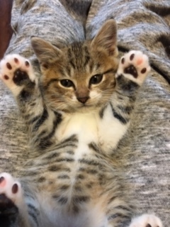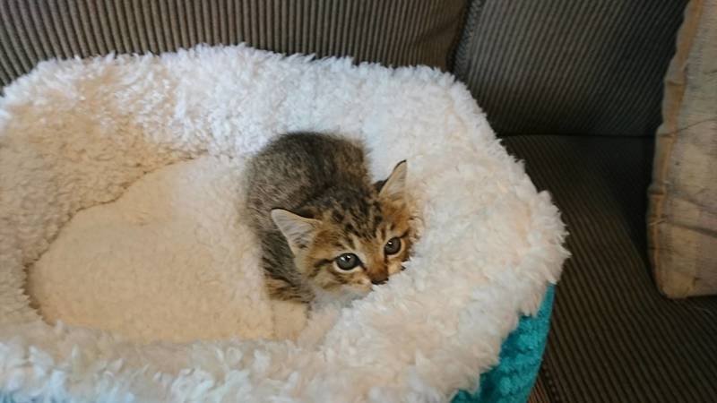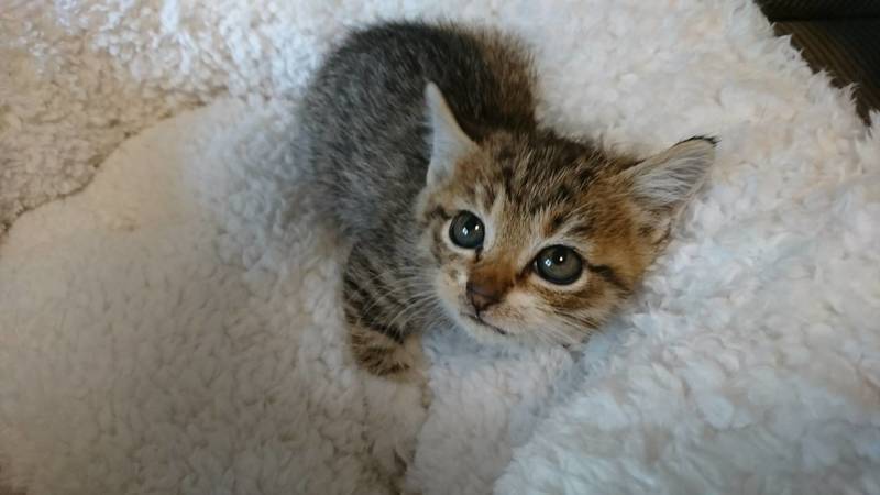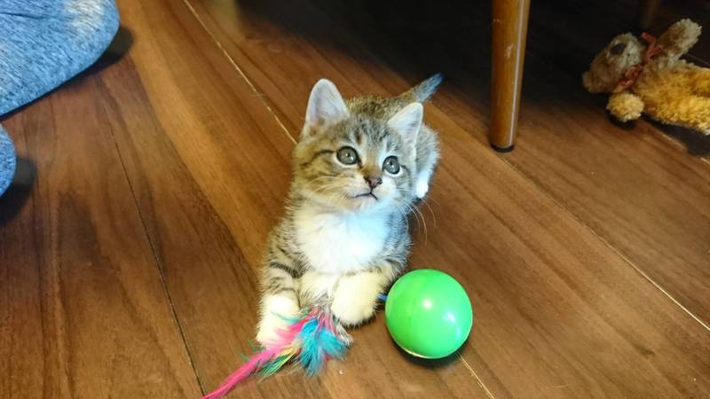 | 特徴(性格など) | 可愛いトラ模様の男の子です♪ 胸の白い毛がよだれかけのようで前足は白いくつしたをはいているようです♪♪ しっぽはまっすぐ長いです。 ぴょんぴょん跳ねながら元気に遊んでいます♪ 甘えん坊で抱っこするとゴロゴロいいながら眠ります。。。 |