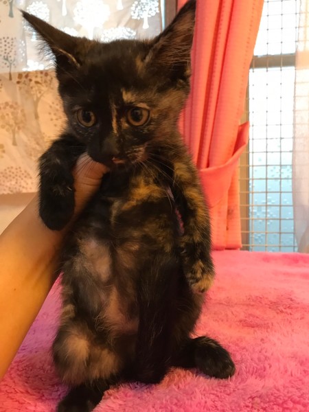 | 特徴(性格など) | 生後3ヶ月のサビ猫ちゃん(メス)です。 最初は少し怖がりさんですが、少し前にトライアルに行った兄妹達もみんな数日で順調にご家族さんに慣れていっています! 人に抱かれると借りた猫ちゃん状態ですが、ほんとは兄妹達とどってんばってんの追いかけっこをしているお転婆なお姫ちゃまです! 食欲旺盛で快便快食!追いかけっこも大好き、抱かれれば静かにジーッとしてる子(慣れたら分かりませんが…)で健康な子です。 サビ猫ちゃんは人見知りする子も多いですが、1回懐くと飼い主さんに忠実で甘えんぼさんですよぉ〜(^^) |