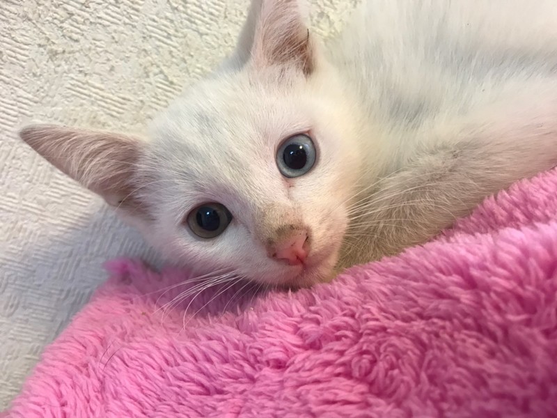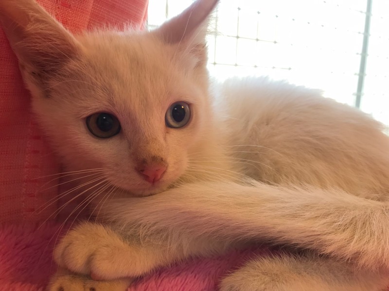| 特徴(性格など) | オッドアイのお目目に全身真っ白で尻尾も綺麗に長い白猫君です。 最初は少し怖がりさんですが、少し前にトライアルに行った兄妹達もみんな数日で順調にご家族さんに慣れていっています! 人に抱かれると借りた猫ちゃん状態ですが、ほんとは兄妹達とどってんばってんの追いかけっこをしている元気でやんちゃな男の子です! 食用旺盛で快便快食!追いかけっこも大好き、抱かれれば静かにジーッとしてる子(慣れたら分かりませんが…)で健康な子です。 人見知りさんは懐くとすっごく甘えんぼさんになりますよ〜!家庭に入ってからの変貌に乞うご期待です(^^) 健康状態 特に異常無し。 母猫を隔離1ヶ月後に血液検査をしてエイズ・白血病陰性。 |