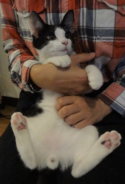 | 特徴(性格など) | 男前なハチワレです。 ちょっとビビりなのが玉に瑕ですが、仔猫なのですぐに懐いてきます。 他の大人猫とも仲良くできます。 食事:ドライフード トイレ:失敗なし 爪切り:できます エイズ・白血病:陰性 ワクチン:2019年10月27日接種済 |