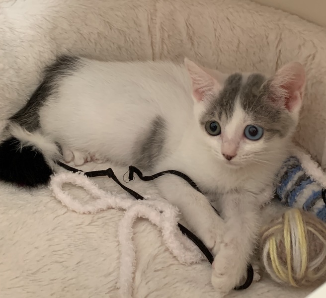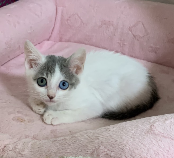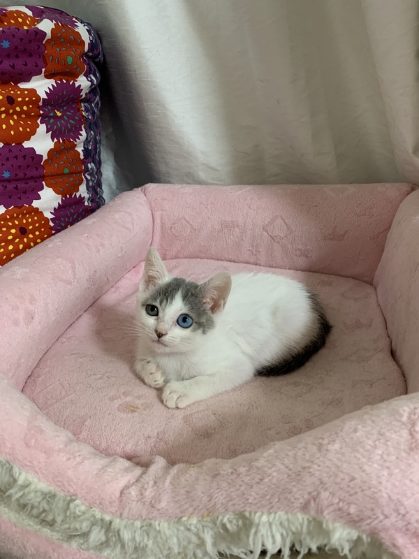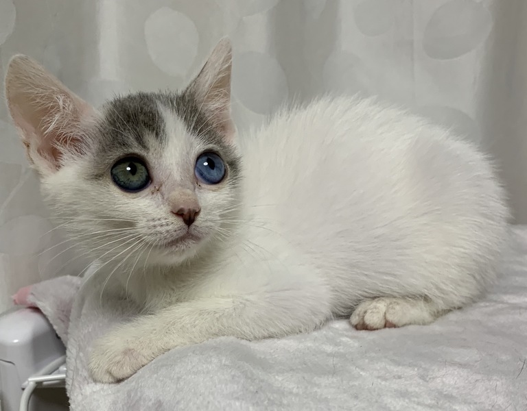 | 特徴(性格など) | 頭とお腹、尻尾がキジ茶のオッドアイは珍しいかもです。 3匹の中ではおっとりしていてマイペースな、花より団子女子です。 ちょっとぽっちゃり。 ゴハンの催促以外はあまり鳴きません。 躾:爪切り、耳掃除、爪とぎOK。 抱っこはやや苦手。 |