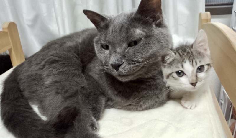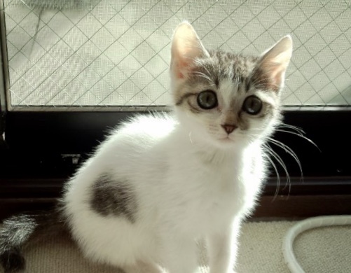 | 特徴(性格など) | 頭と尻尾はキジトラで、体はブチというおもしろい柄です。 3匹の中で一番健康状態が悪かった為、小柄ですが元気で走り回ります。 控えめ?な性格で、猫嫌いの大人猫でも傍に居ることができます。 躾:爪切り、耳掃除、爪とぎOK。 抱っこはやや苦手。 |