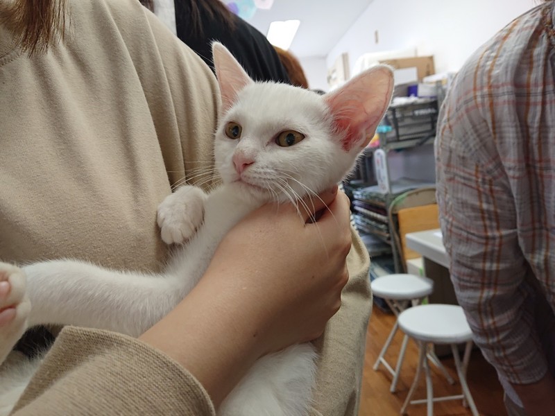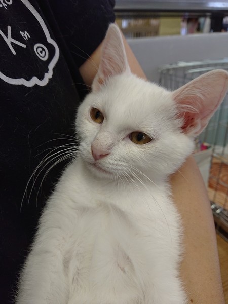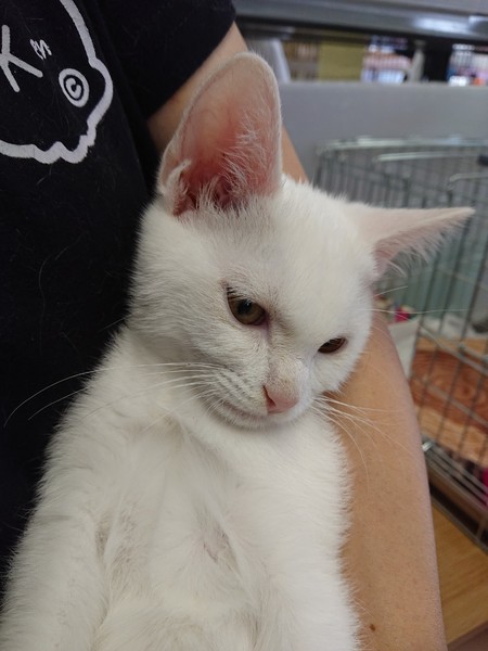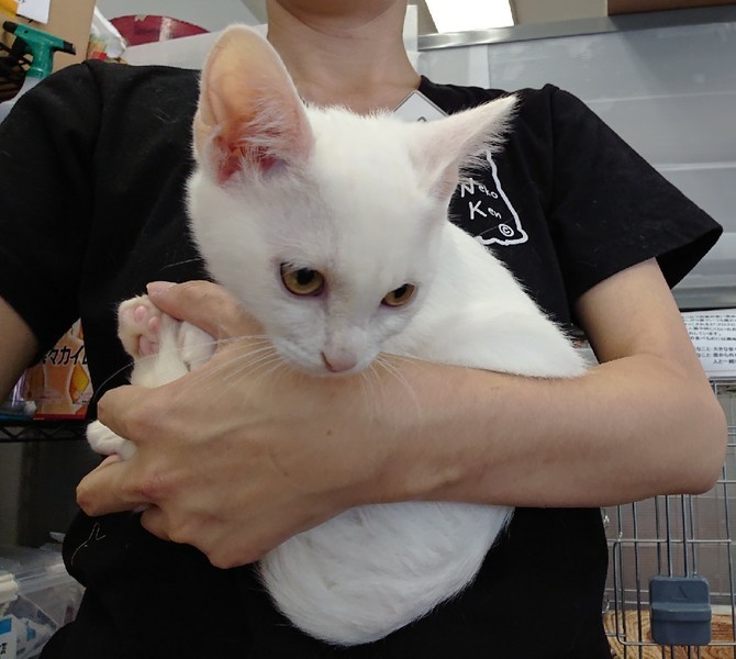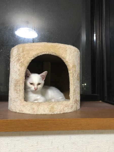 | 特徴(性格など) | 2019.7.8生まれ(推定) 毛色:白 全身真っ白のふわふわな男の子。 イタズラ大好きの元気っ子!! 抱っこすると喉をゴロゴロ鳴らしちゃう甘ったれさん。 人に対して少しビビリなところもありますが、姉猫(仮)と一緒に過ごしていたので猫慣れはしています。 トイレや爪とぎの場所を1回で覚えてくれる賢い子です。 |