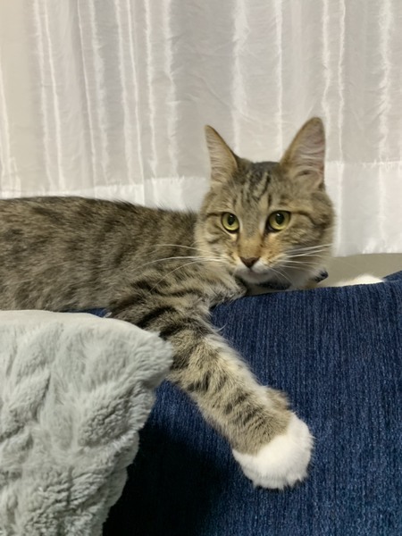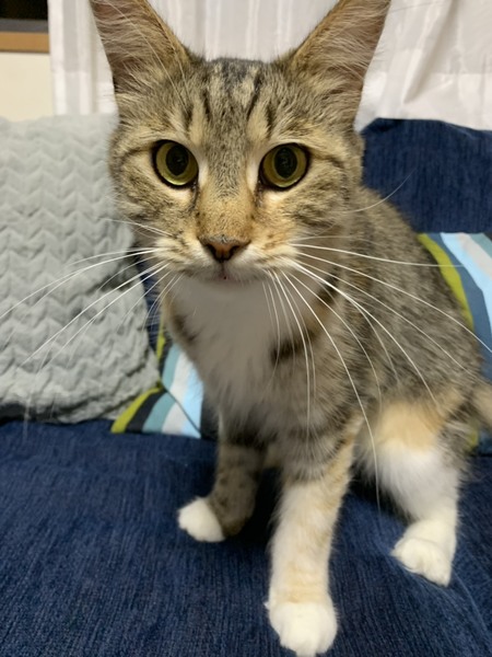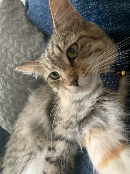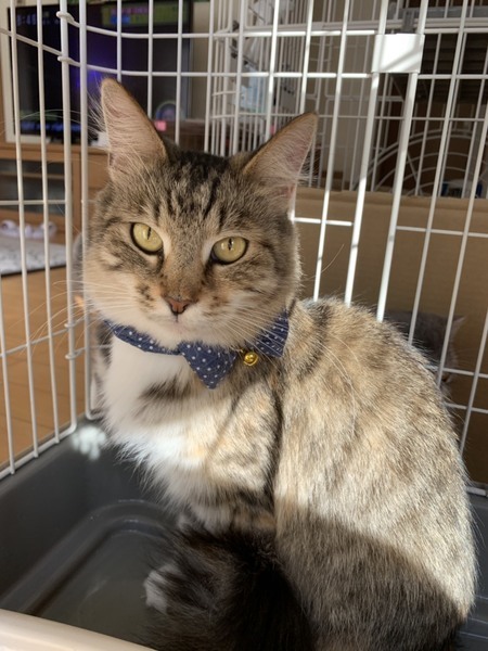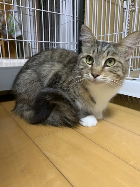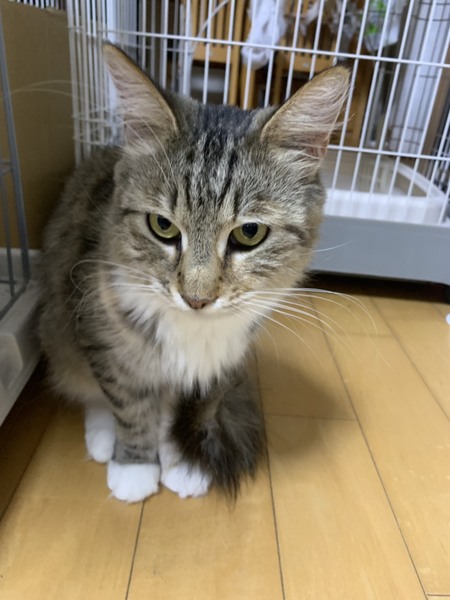 | 特徴(性格など) | メインクーンの女の子、ブラウンパッチドタビーホワイト おとなしくて飼いやすいこです。撫でられるとゴロゴロ嬉しそうにしています。 トイレもきちんとできています。 今はゲージの外での初めてのことに興味深々な様子です。 健康上問題はありませんが、体型は痩せ気味です。産後下痢していたそうです。ごはんはしっかり食べています。 |
