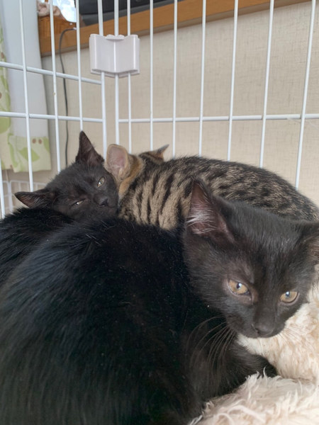 | 特徴(性格など) | あたちは、まりちゃんでしゅ 三キョウダイの中では、一番やんちゃでしゅ♡ 抱っこ大しゅきのあまあまの甘えん坊でしゅ♡ あそぶこともだいしゅきだけど、とっても食いしん坊にゃんでしゅ♡ おもちゃで遊んでくれて、美味しいご飯が食べられて、抱っこしてくれたら、あたちはそれだけで幸せにゃんだよ。 ―――――――――――――――――――――――――――――― 元気いっぱい!食欲旺盛!そして、抱っこが大好きな文句なしのかわいい黒猫の子猫ちゃんのご紹介です。 メスちゃんです。 まだ年齢は2か月半ぐらいですが、お届けする頃にはちょうど3か月ぐらいになります。 小さな時に保護したので、人馴れは抜群です。 まりちゃんは、キョウダイの中で一番活発で元気いっぱいです! そして、食いしん坊! そして、あまあまの甘えんぼさんなので、抱っこされながら寝てしまいます。 迎えてくださる里親様は、堪らなくかわいいと思います。 この子達は、三姉妹で保護されました。 同じく譲渡会に一緒に参加するわかちゃん(黒猫)と、ふうかちゃん(キジ白)と同じキョウダイとなります。 子猫ですので、2匹飼いをご希望の方は、同じキョウダイとの組み合わせをオススメします。 子猫の場合は、2匹一緒に育てた方が飼いやすいので、もし、2匹一緒に迎える余裕の方には2匹飼いをオススメしております。(子猫の場合は、遊びながらお互いが育って行きますので、飼い主に依存せずにある程度ほっといてあげることができます。) 猫飼い初心者OK。 お子さんがいるご家庭も、猫アレルギーをパスしていれば、是非ともお子さんと一緒に育てて行きたいと願います。 カリカリも食べられる子達ですから、パートタイマーのお仕事をお持ちのご家庭でも、全く問題ありません。半日ぐらいのお留守番は可能です。 とにかく、文句なしのかわいい子猫ちゃん達ですので、是非ともよろしくお願い申し上げます。 ケージの貸し出しなどは、可能ですので、スタッフまでご相談ください。まりちゃんの場合は、お部屋を区切って隠れ場所を確保してくだされば、ケージなしからのスタートでも可能そうです。要相談でお願いします。 |