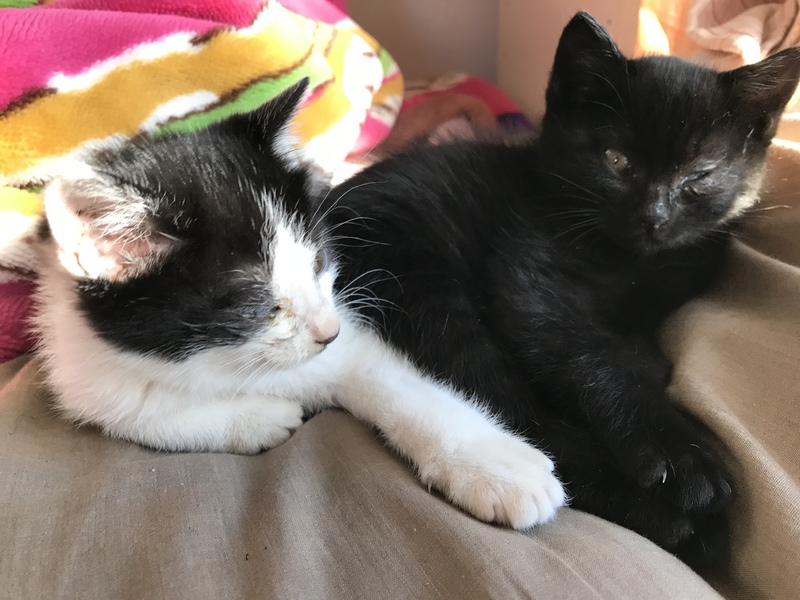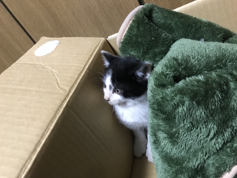 | 特徴(性格など) | ①黒色。人懐っこく、好奇心旺盛。拾った1日目には私の肩で寝ちゃいました。左目が少し目脂が出ちゃってます。 ②白黒。黒い方と比べるとビビリ気味。少しでも慣れるとくつろぎ始めます。この子は右目に目脂が出ちゃってます。 |
