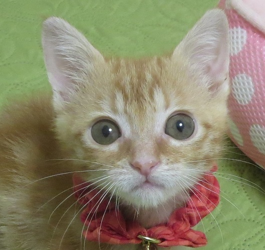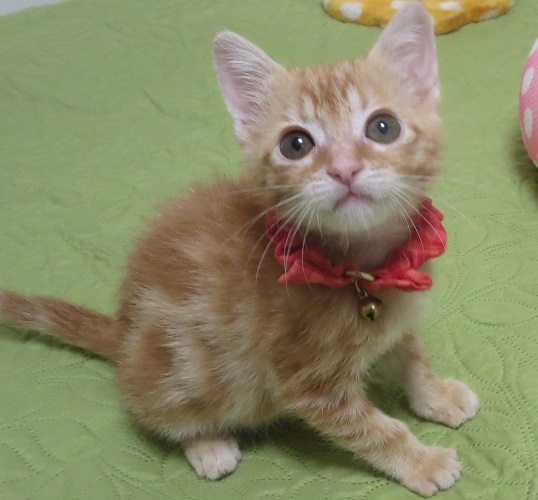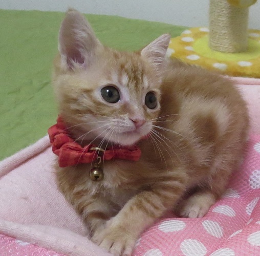 | 特徴(性格など) | 小さい時から人の家で育ったので、怖がることを知らない無防備な甘えん坊さんです。 茶トラですが、渦巻きと大きな縦じまがはっきりとしたなかなか見事な模様なので、大きくなったらさぞかし見応えあり!だろうと思います。性格は可愛くて可愛くて、ともかく甘えん坊! |