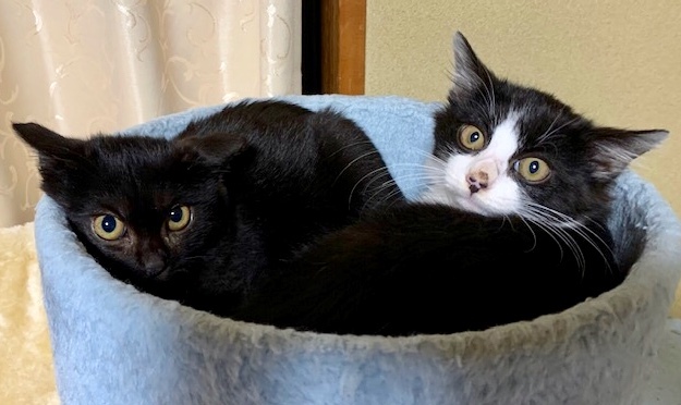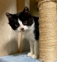 | 特徴(性格など) | 黒白の八割れフェイスがキュートな3ヵ月の男の子です。 保護直後は、人間を怖がっていましたが、徐々に慣れてきて、今では撫でられるのが大好きです。 やんちゃな性格で、カーテンレールやゲージの上によじ登り、姉猫のウェンディが見守る中、たまにコケたりしています。 一緒に保護した姉猫ウェンディとは固い絆で結ばれていて、ウェンディの姿が見えなくなると鳴いて呼びます。 甘えん坊の可愛い男の子です。 |