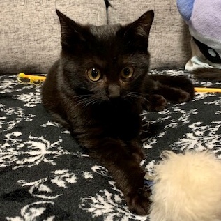 | 特徴(性格など) | 黒猫の3ヵ月の女の子です。 保護直後は、人間を怖がっていましたが、少しずつ心を開いてくれています。 首を撫でられるのではが大好きで、幸せそうにゴロゴロ鳴きます。 臆病なところがありますが、まだまだ甘えたい月齢。 先住猫が鳴くと母猫を思い出すのか、嬉しそうに駆け寄ってスリスリしています。 一緒に保護した弟猫のピーターとは固い絆で結ばれていて、ピーターが鳴くと、返事をして駆け寄ります。 夢中で遊んでいるピーターの後ろで、静かに一人遊びしている控え目で可愛らしい女の子です。 |