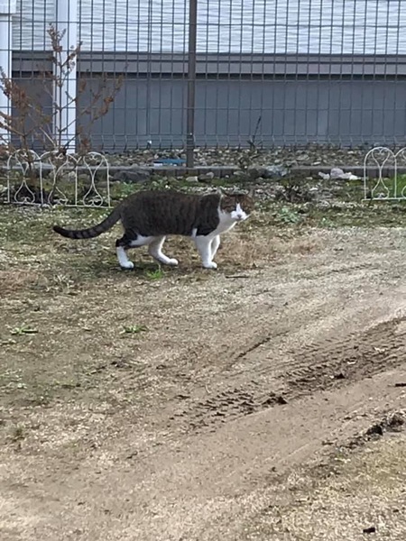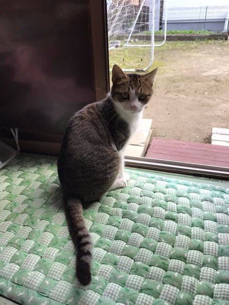 | 特徴(性格など) | 黒のしま猫 以前どこかで飼われていたようです。 あまり外に出たがらず、中にいる事が多く、人が来ると足元に絡みついてきます。甘えたがりです。 |