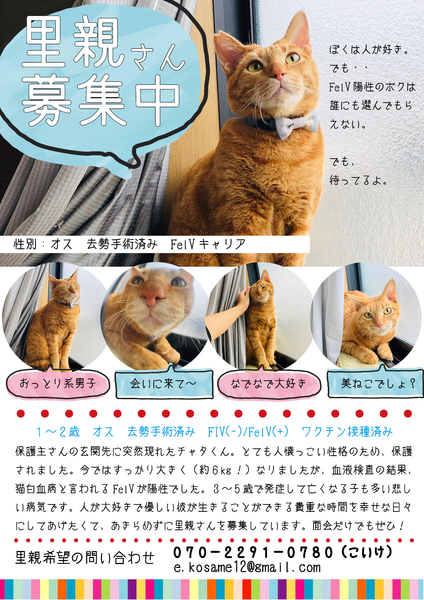 | 譲渡費用(医療費、交通費など) | 医療費一部協力(去勢手術、ワクチン2回、血液検査2回、済み)として5,000円 | ||