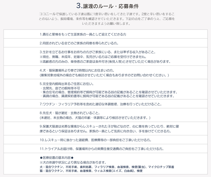 | その他(譲渡条件など) | ✱応募方法✱ 里親希望の方は、以下のURL又は画像に記載の『譲渡のまでの流れ』『譲渡のルール・応募条件』『譲渡に関してのお願い』のご確認のうえ、『里親希望エントリーフォーム』よりご応募をお願い致します。 ※お返事には1週間程度のお時間が掛かる場合があります。 『譲渡のまで流れ』 https://coconeel.wixsite.com/website/bosyunonagare 『譲渡に関してのお願い』 https://coconeel.wixsite.com/website/blank-4 『譲渡のルール・応募条件』 https://coconeel.wixsite.com/website/blank 『里親希望エントリーフフォーム』 https://coconeel.wixsite.com/website/entry ※ご質問等ある場合は、フォームの最後の欄にお書き添えください。 ※先着順ではありません。 犬の性格・年齢・病気等を考慮し、多方面から検討させていただきます。 |