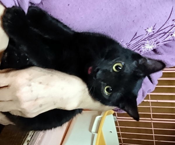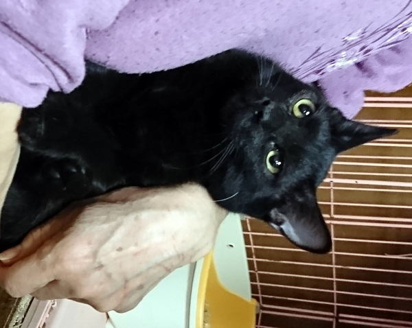 | 特徴(性格など) | 黒猫の男の子。(しっぽは長め) ちょっと怖がりで人見知りをするので初対面の人には”シャーッ”と言ってしまいますが、慣れると抱っこも出来るようになり、とってもかわいい子です♪ 最初、慣れるまでは少し時間がかかったとしても、長い目で見て接してくださる優しい里親さん、探しています。 |