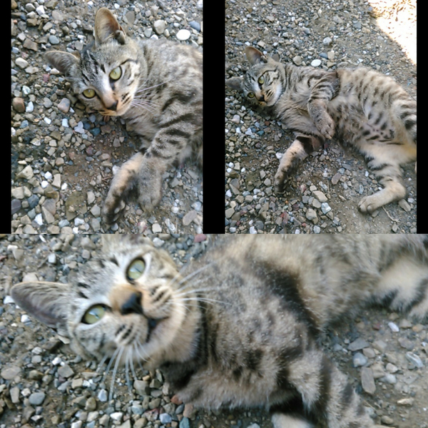 | 特徴(性格など) | 焦げ茶色のきじとら♪ 野良猫ちゃんですがご飯を与えると甘えてくれるそうです。 |