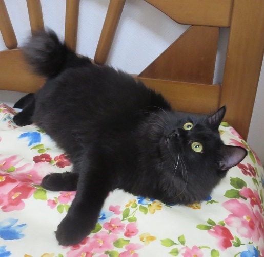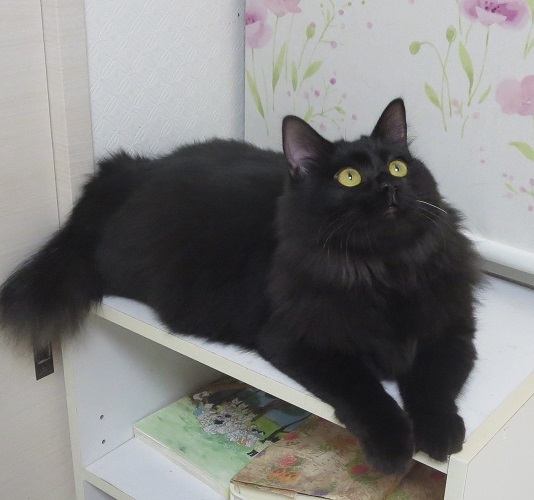 | 特徴(性格など) | 洋猫ミックスで、綺麗な半長毛、目のぱっちりとした美形ネコですが、ガサツというか、動きがジタバタしています。 小さい時に兄妹3匹で保護されて、お兄ちゃん2匹は夫々幸せな飼い猫生活を送っていますが、兄妹で断トツに小さかった金魚ちゃんは、なかなか体調が安定せず、長い入院生活を送り、九死に一生を得た子です。 小さい時はひらひらと、可憐な黒い金魚のようだったのですが・・ 今ではずっしりとしたダンプのように成長し・・どたばたしています。 外見はなかなか見事なのに、どたばたダンプ・・ 女の子にありがちな気ままな面もあるのに、実は心はチキンハート、意気地なし。 良い面も悪い面も、混在している子です。 |