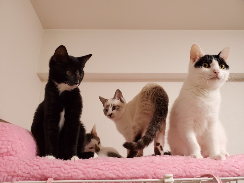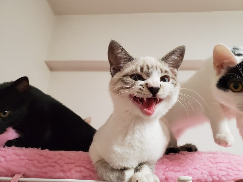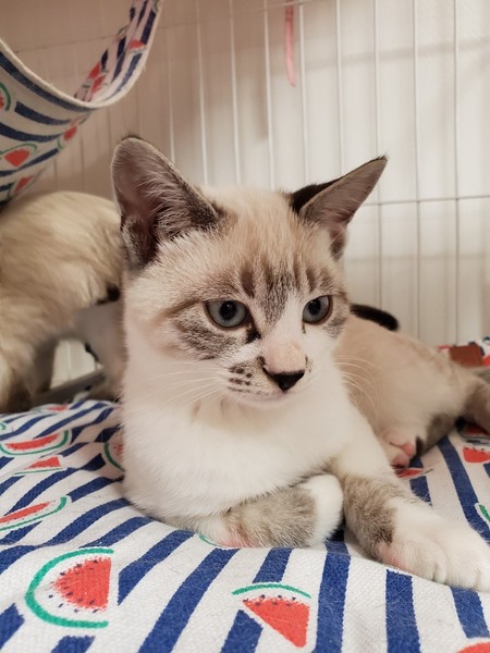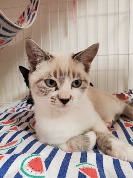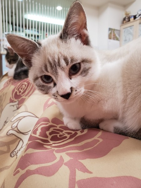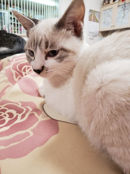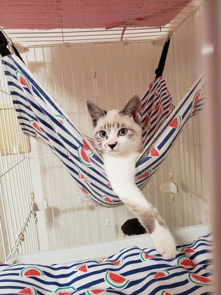 | 特徴(性格など) | 2019.8.8生まれ(推定) 毛色:白 シャム系 人懐っこく、スリスリ・ゴロゴロ甘えん坊なシャム風ミックスの男のです。 ハンモックが好きで、眠くなるとケージの中のハンモックに戻り寝ています。 人のお腹の上も大好きです。 ケージ慣れ、人慣れ、猫慣れしています。 |