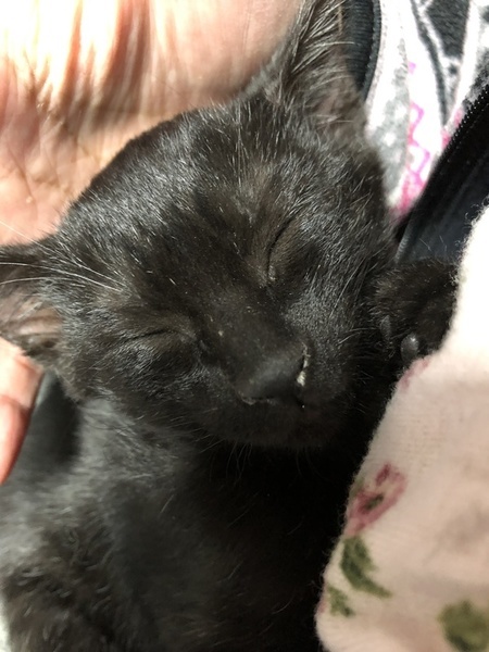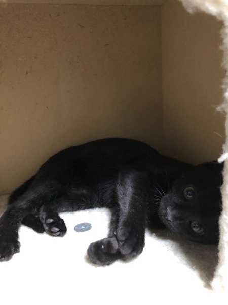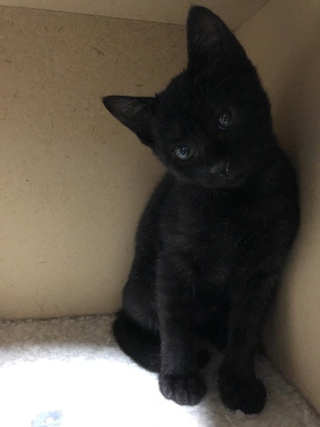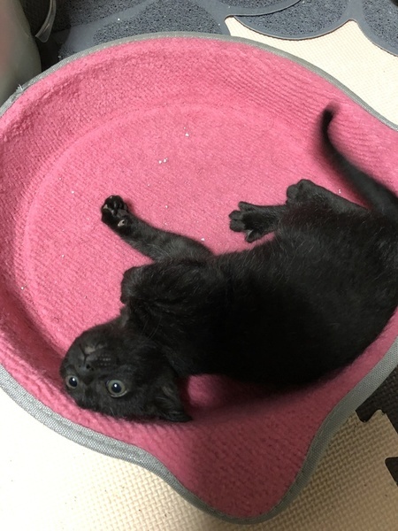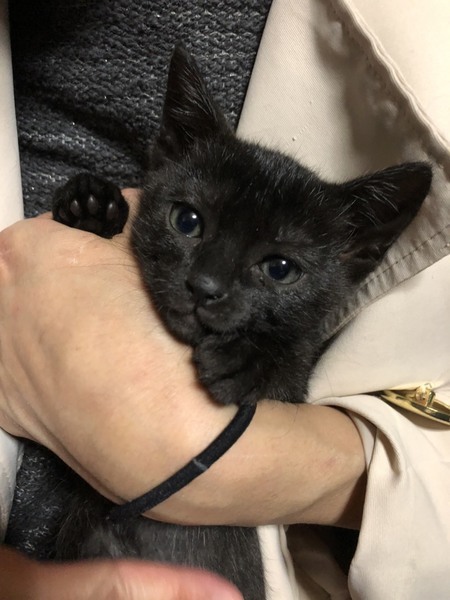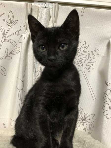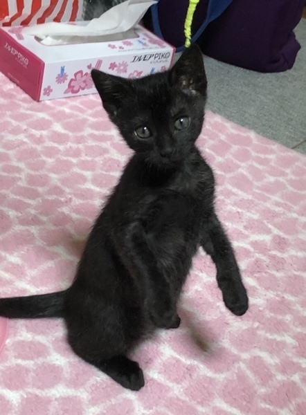 | 特徴(性格など) | 傷が治るまでは大人しい感じでしたが姉妹とよく遊び元気に育ちました。好奇心旺盛のやんちゃっ娘。一人で遊ぶのも遊んでもらうのも大好き。肩乗りニャンコ。 今のところ人見知りなどはありません。抱っこされるよりは遊んでいる方が好きみたいです。とにかく元気で見ていて飽きません。 目の色は緑と茶色が混じったようなヘーゼルっぽいです。 毛の色はパッと見は黒ですが、お腹の方が白い毛がよく混じっているようです。真っ黒ではなく少し茶色い毛も混じっていて手足のあたりはトラ模様があります。 |