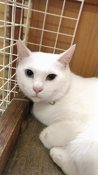 | 特徴(性格など) | オッドアイの目が大変美しいです。 しっぽは短く大変きれいな白ねこさんです。耳カットあり。 大変穏やかな性格です。 多頭飼育で過ごしているためかもしれませんが目立った自己主張がなく静かに過ごしています。 |