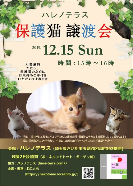 | その他(譲渡条件など) | ☆生き物と暮らしてから 「こんなはずじゃなかった」は通用しません。最期まで責任をもって 「家族」として愛情をもって暮らしてください。 譲渡条件・譲渡費用・お届け範囲をよくご理解の上 ご家族全員の同意を得られてからご応募ください。 譲渡条件・譲渡費用 https://nekotomo.localinfo.jp/pages/3190427/page_201909061743 【お届け可能範囲】 埼玉県:秩父市等遠方は要相談 東京都:北区まで 千葉県:柏市辺りまで 茨城県:守谷市辺りまで 栃木県:栃木市市辺りまで 群馬県:館林市辺りまで ※該当県内で範囲に入っていない場合は、一度お問い合わせください。※交通費・高速代ご負担いただきます。 ☆ねこともは、子猫を中心に自分たちでできる範囲での保護猫活動をしております。 子猫入園が多いため 医療費等の経費はご負担いただいております。 ☆複数応募者がいた場合、近隣またはペアで引き取れる方を優先とします。 また、持ち家・家族でお住まいの方が優先になります。(お届け範囲はお問い合わせください・交通費ご負担いただきます) お答えいただいたアンケート・またはお見合いの際のお話内容でスタッフで審査させていただく場合がございます。 その結果お断りする場合もございますのでご了承ください。 ☆譲渡決定がされた場合でも その後のお話合い、飼育環境によってはお断りする(連れて帰る)場合がございます。 あらかじめご了承ください。(連れ帰った場合交通費・手数料はいただきます) ☆「3か月未満」の子猫をご希望の場合は、お留守時間が4~5時間以内のおうちにしか譲渡はできません。 また、10歳以下のお子さんがいらっしゃるご家庭はお断りしています。 ☆基本的に「トライアル期間」は設けておりません。 先住猫がいる場合はトライアル期間2週間設けます。(トライアル中の飼育費用・病院代はすべて譲受人持ちになります) 1日とか数日で 「この子は慣れません」などと言われるような方のご応募は受け付けておりません。 トライアルで終わった場合も交通費・手数料は頂戴いたしますのでご了承ください。 ☆先住猫(または犬)は2匹までとさせていただきます。 ☆猫のしあわせのため不躾な質問をさせていただくことがあります。ご了承ください。 【お見合い】 個別でのお見合いは基本的には行っておりません。 ☆これからの譲渡会の予定☆ 2019年12月15日 さいたま市見沼区島町393番地 ハレノテラス 2019年12月22日 さいたま市見沼区島町393番地 ハレノテラス 2020年1月13日 柏市豊四季301-2 2F 根本ダンススタジオ 2020年1月19日 さいたま市見沼区島町393番地 ハレノテラス ※ご希望の子が前の譲渡会で決定している場合は参加しませんのでご了承ください。 ※お見合い希望の場合は前もって お問い合わせいただき、どこの譲渡会場でお見合い希望かをご連絡ください。(ご希望日前の譲渡会で決定している場合がございます。予めご了承ください) ※譲渡会場にどうしても来場できない場合は お見合いに伺いますが、お見合いで終わった場合も交通費はご負担ください。 ※飼育環境を拝見したいので自宅にお届けになります(交通費ご負担願います) 【SNS等 ねこともについて詳細知りたい方は下記ご覧ください】 ねこともホームページ https://nekotomo.localinfo.jp/ ねことも Facebook https://www.facebook.com/nekotomodati/ ねことも ブログ https://ameblo.jp/nekotomo2222/ ねことも インスタ nekotomo2222 ねこともメール:nekotomo2222@yahoo.co.jp |