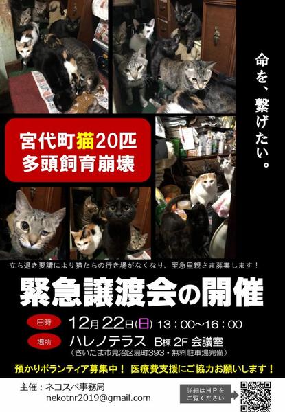 | その他(譲渡条件など) | ☆生き物と暮らしてから 「こんなはずじゃなかった」は通用しません。最期まで責任をもって 「家族」として愛情をもって暮らしてください。 譲渡条件・譲渡費用・お届け範囲をよくご理解の上 ご家族全員の同意を得られてからご応募ください。 譲渡条件・譲渡費用 https://nekotomo.localinfo.jp/pages/3190427/page_201909061743 【お届け可能範囲】 埼玉県:秩父市等遠方は要相談 東京都:北区まで 千葉県:柏市辺りまで 茨城県:守谷市辺りまで 栃木県:栃木市市辺りまで 群馬県:館林市辺りまで ※該当県内で範囲に入っていない場合は、一度お問い合わせください。※交通費・高速代ご負担いただきます。 ☆ねこともは、子猫を中心に自分たちでできる範囲での保護猫活動をしております。 子猫入園が多いため 医療費等の経費はご負担いただいております。 ☆複数応募者がいた場合、近隣またはペアで引き取れる方を優先とします。 また、持ち家・家族でお住まいの方が優先になります。(お届け範囲はお問い合わせください・交通費ご負担いただきます) お答えいただいたアンケート・またはお見合いの際のお話内容でスタッフで審査させていただく場合がございます。 その結果お断りする場合もございますのでご了承ください。 ☆譲渡決定がされた場合でも その後のお話合い、飼育環境によってはお断りする(連れて帰る)場合がございます。 あらかじめご了承ください。(連れ帰った場合交通費・手数料はいただきます) ☆「3か月未満」の子猫をご希望の場合は、お留守時間が4~5時間以内のおうちにしか譲渡はできません。 また、10歳以下のお子さんがいらっしゃるご家庭はお断りしています。 ☆基本的に「トライアル期間」は設けておりません。 先住猫がいる場合はトライアル期間2週間設けます。(トライアル中の飼育費用・病院代はすべて譲受人持ちになります) 1日とか数日で 「この子は慣れません」などと言われるような方のご応募は受け付けておりません。 トライアルで終わった場合も交通費・手数料は頂戴いたしますのでご了承ください。 ☆先住猫(または犬)は2匹までとさせていただきます。 ☆猫のしあわせのため不躾な質問をさせていただくことがあります。ご了承ください。 【お見合い】 個別でのお見合いは基本的には行っておりません。 ☆これからの譲渡会の予定☆ 2019年12月15日 さいたま市見沼区島町393番地 ハレノテラス 2019年12月22日 さいたま市見沼区島町393番地 ハレノテラス 2020年1月13日 柏市豊四季301-2 2F 根本ダンススタジオ 2020年1月19日 さいたま市見沼区島町393番地 ハレノテラス ※ご希望の子が前の譲渡会で決定している場合は参加しませんのでご了承ください。 ※お見合い希望の場合は前もって お問い合わせいただき、どこの譲渡会場でお見合い希望かをご連絡ください。(ご希望日前の譲渡会で決定している場合がございます。予めご了承ください) ※譲渡会場にどうしても来場できない場合は お見合いに伺いますが、お見合いで終わった場合も交通費はご負担ください。 ※飼育環境を拝見したいので自宅にお届けになります(交通費ご負担願います) 【SNS等 ねこともについて詳細知りたい方は下記ご覧ください】 ねこともホームページ https://nekotomo.localinfo.jp/ ねことも Facebook https://www.facebook.com/nekotomodati/ ねことも ブログ https://ameblo.jp/nekotomo2222/ ねことも インスタ nekotomo2222 ねこともメール:nekotomo2222@yahoo.co.jp |