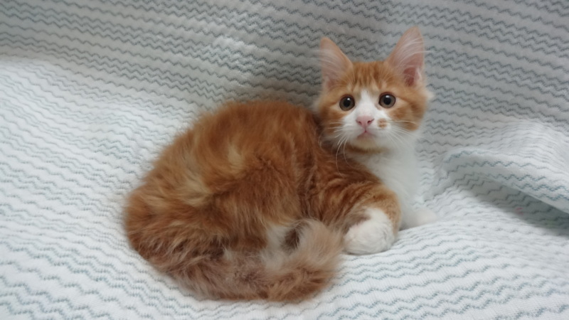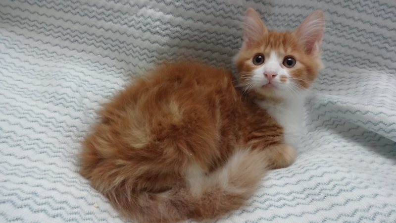 | 特徴(性格など) | 【仮名】じろうくん 【性格】コイツはヤバイっす!かわいすぎます! 茶トラで長毛ってコレはもはや反則なのでわ(笑) フワッフワとした毛色が特徴のハンサム君という感じです♪ おもちゃを咥えて行ったり来たりと天真爛漫かつオレ様っぷりも(笑) 掃除中に駆け寄ってきて膝に乗ったり手にちょっかいを出したりと 可愛らしいしぐさを見せてくれます。(*´ω`*) ☆☆わりと穏やかな性格です☆☆ 甘えん坊になる要素も持っているコなので成長が楽しみです♪ 兄妹のえくぼちゃんとのお迎えを希望します。 幼い月齢ですので、お留守番時間がない、もしくは少ないご家族に託したいと思います。 |
