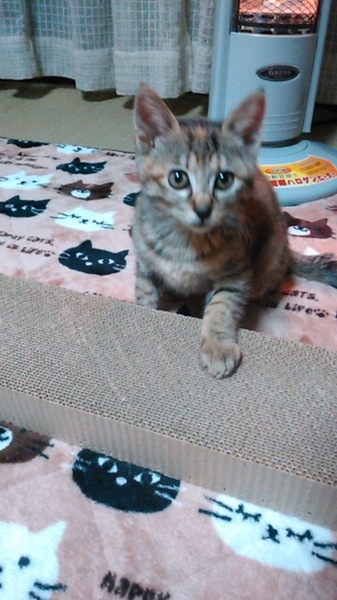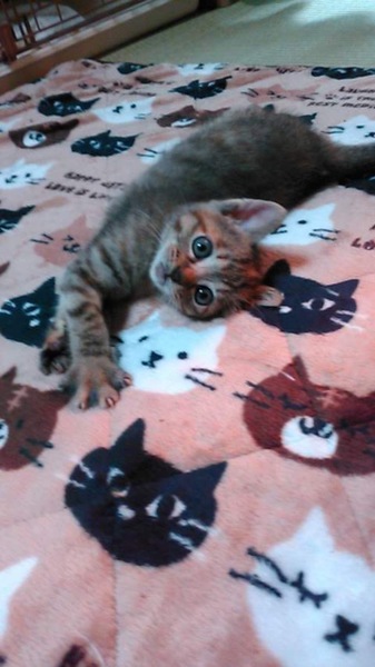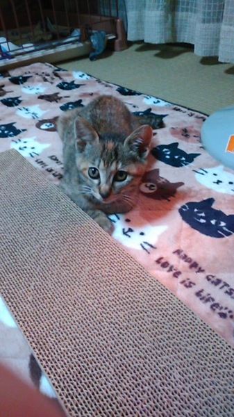 | 特徴(性格など) | キジ柄の女の子です。生後1週間頃に保護してミルクから育てました。人馴れもしていて元気いっぱいです。 | ||