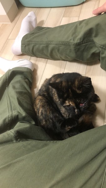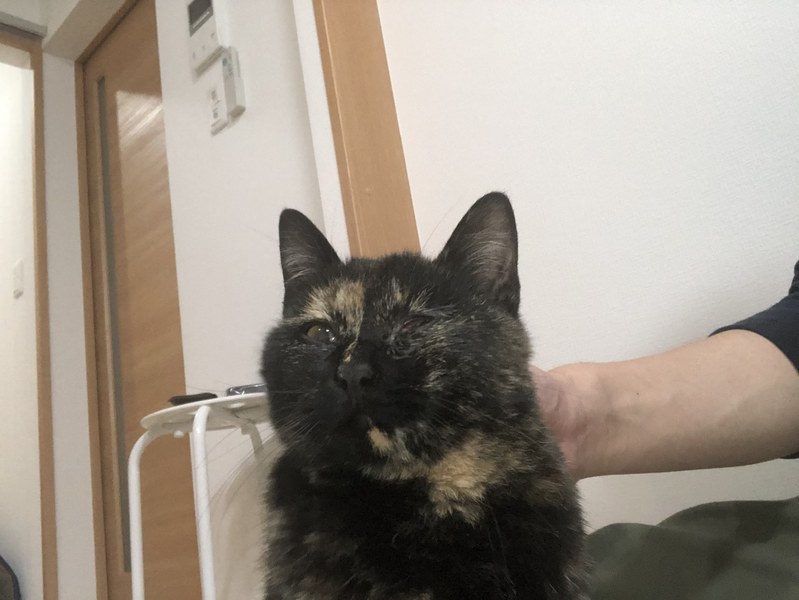 | 里親募集する理由 | 11月から近くのスーパーで見かけるようになったのですが,二週間ほど前から眼が腫れてきていたので保護しました.当人学生で,アパートはペット禁止なので里親を募集することに致しました.アパートの管理会社さんに頼み込み,12月末までの一時的な保護の了承を得て急ピッチで探しているところです. | ||