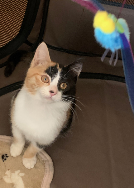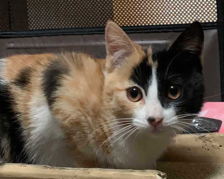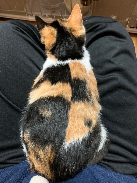 | 特徴(性格など) | タイトルにも書きましたが背中の模様がパッチワークのような三毛ちゃんです。 ちょっとビビリの性格ですがご飯の時やお気に入りのおもちゃで遊んでもらえる時は 思いっきりゴロゴロ喉を鳴らします。 |